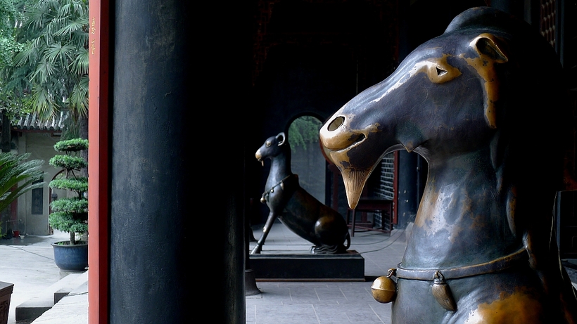 Бронзовые статуи козы можно встретить у входа в Зал Трех Начал. Их уже отполировали до блеска посетители, которые верят, что прикосновение к статуе принесет им удачу. Одна коза там, кстати, очень необычная, главное, внимательно посмотреть:)