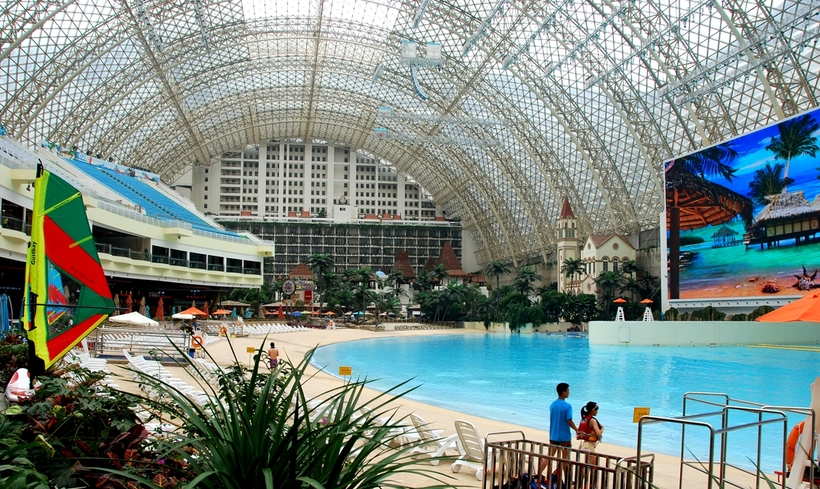 Что же там внутри? Кроме огромного количества магазинов, офисов, ресторанов, конференц-залов, двух пятизвездочных отелей, ледового катка и самого большого в Чэнду кинотеатра IMAX, есть и то, что просто в голове не укладывается. Внутри торгового комплекса китайцы обустроили искусственный пляж, площадью в 5 тыс. м², который может одновременно вместить более 500 человек. Если захотите его посетить, то вот вам полезная информация: пляж работает с 10:00 до 20:00, а вход стоит 28 долларов (180 юаней).