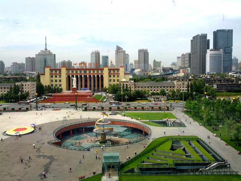 Находится вокзал недалеко от центра. От него легко можно добраться до основных мест на метро, автобусе или такси. Прямо рядом с вокзалом есть станция метро North Railway Station (火车北站), что очень удобно. Центром города Чэнду считается площадь Тяньфу (Tianfu Square天府广场), до нее нужно проехать всего 4 остановки на метро (по времени займет 10 минут – самый быстрый и удобный способ) и выйти на одноименной станции или воспользоваться автобусами номер 16, 52, 55 (30-40 минут). За такси нужно будет заплатить примерно 2-3 доллара. На фото ниже главная площадь города.