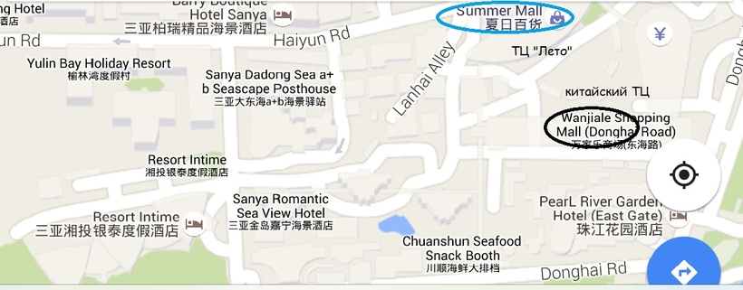 Если хотите жить в городе Санья (имейте ввиду, что это уже бухта Санья, а не Дадунхай), выберите отели около Yifang General Merchandise Plaza. Тут есть любые, начиная от 2- и до 5-звездных. Это, я думаю, оптимальное место в городе: близко пляж, основные торговые центры и рынки, достопримечательности. И в то же время не совсем около пешеходной улицы, где вечером очень шумно.