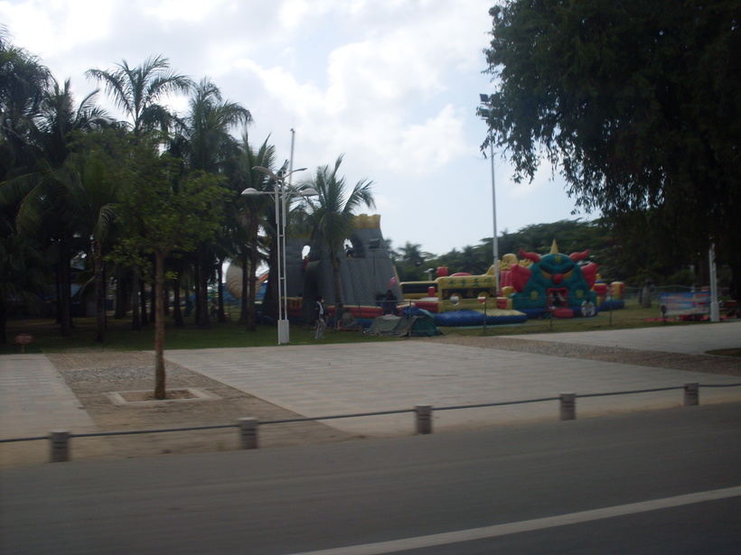 Мы жили в отеле Resort Intime. В шаговой доступности от него, буквально в нескольких минутах ходьбы находится парк. В нем есть пара-тройка аттракционов, детские батуты и пруд с рыбками, которых за небольшую плату можно покормить из бутылочки. Эти рыбы повсюду на Хайнане, они золотистого цвета, похожи на наших сомов. Они так набрасываются на бутылочку с едой! Детки, да и взрослые тоже, просто пищат от восторга.
