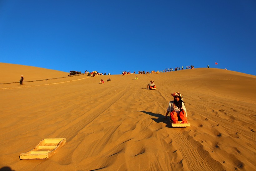 Ученые объясняют, что это феномен происходит из-за трения песчинок друг о друга, ну а местные охотно делятся легендой, которая мне нравится больше, чем научное объяснение. Однажды в этих краях было сражение двух вражеских армий, когда вдруг налетела песчаная буря и засыпала всех воинов песком. С тех под из под песка доносятся голоса погребенных заживо людей. Звучит немного жутко, но интересно. Из развлечений здесь можно пройти караваном верхом на верблюде ($ 15 / 100 юаней за 40 минутную прогулку) и покататься на доске по песчаным склонам (около $2.5 или 15 юаней).