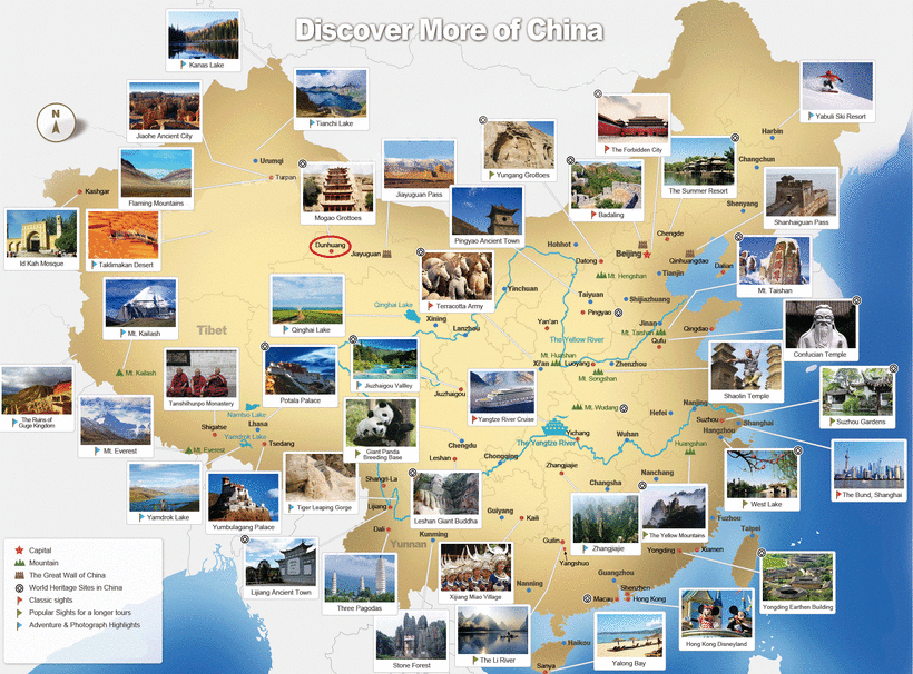 Ниже, на карте основных туристических достопримечательностей страны, я обвела красным Дуньхуан.