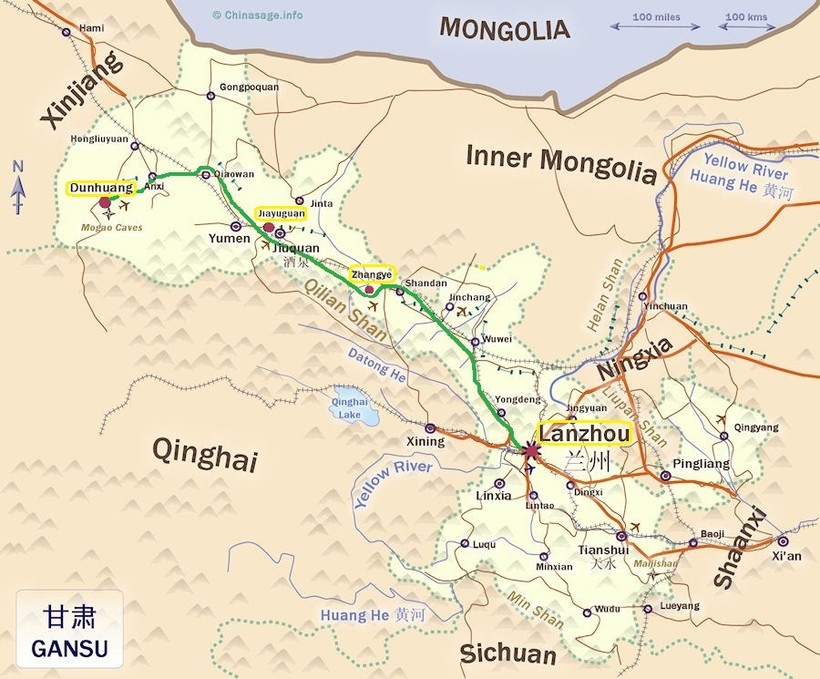 Можно на самолете долететь до Ланьчжоу (бывают дешевые перелеты из Пекина и других городов), а затем на поезде проехать по маршруту Ланьчжоу-Чжанъе-Цзяюгуань-Дуньхуан, и из Дуньхуана уже улететь обратно. Маршрут обозначен зеленой линией на карте провинции.