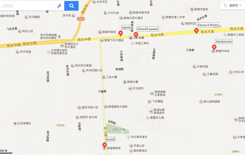 Поехать к гротам Могао прямиком от вокзала или аэропорта будет ближе, но не всегда возможно по одной причине, о которой я сейчас расскажу. Для желающих посетить пещеры есть один важный нюанс, о котором нужно знать. Общее количество посетителей в день здесь ограничено до 6000, поэтому билет необходимо резервировать заранее, особенно если речь идет о высоком сезоне. Забронировать можно на официальном сайте, но он к сожалению только на китайском. Если вы знаете китайский, то за 15 дней до планируемой даты посещения можете сделать это. После вы забираете билет, предъявив документ, на который была оформлена заявка. Если вы не владеете китайским, тогда лучше купить билет в городе, но хотя бы за день до предполагаемого посещения. Есть два пункта выдачи, они же и являются кассами для тех, у кого нет предварительного бронирования. Одна из них находится в городе, недалеко от автовокзала и отеля Yingbin Grand Hotel (迎宾大酒店, yíngbīn dà jiǔdiàn). На китайском ее название выглядит следующим образом: 莫高窟参观咨询预约售票中心 (mògāokū cānguānzīxún yùyuē shòupiào zhōngxīn). Более точное ее расположение можно посмотреть на карте ниже.