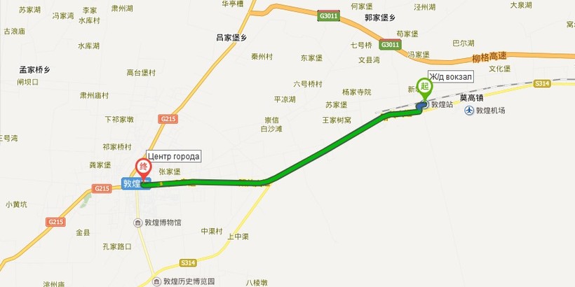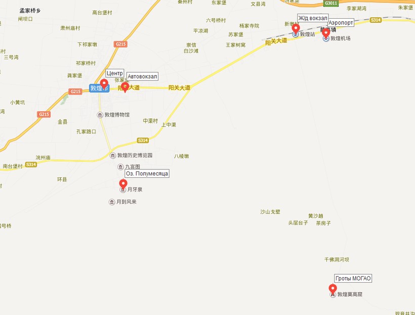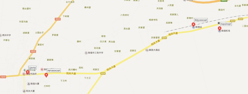 Если вы решили ехать в Дуньхуан на поезде, тогда вам нужно знать, что железнодорожный вокзал находится не в самом городе. Он расположен рядом с аэропортом, расстояние между ними меньше 2-х км, до центра города 12 км, а до Гротов Могао – 16 км. Добраться до города и Могао можно двумя способами: на такси, или автобусе (маршрут я показала на карте ниже).