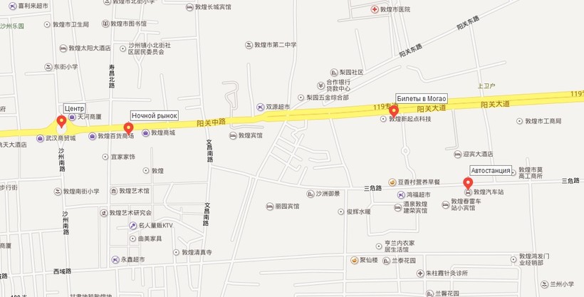 А недорого покушать можно на ночном рынке Dunhuang Shazhou Night Market/敦煌沙洲夜市(dūnhuáng shāzhōu yèshì), что на 阳关中路 (yáng guān zhōnglù), его я отметила на карте ниже.