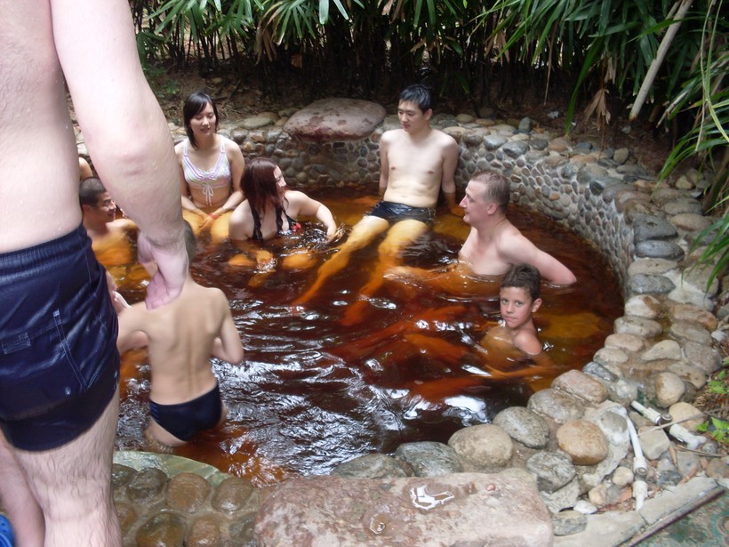 Под ветвями деревьев можно найти очень маленькие укромные бассейны, буквально на 2-3 человека. В один такой я забралась, хотела полежать и расслабиться, но тут пришла китайская женщина, покрутила в кустах какой-то вентиль, и вода в бассейне стала не такой тёплой как раньше! Я, наивная, думала, что из земли бьет какой-то тёплый источник, а оказывается, нет! Подача воды регулируется работниками комплекса.