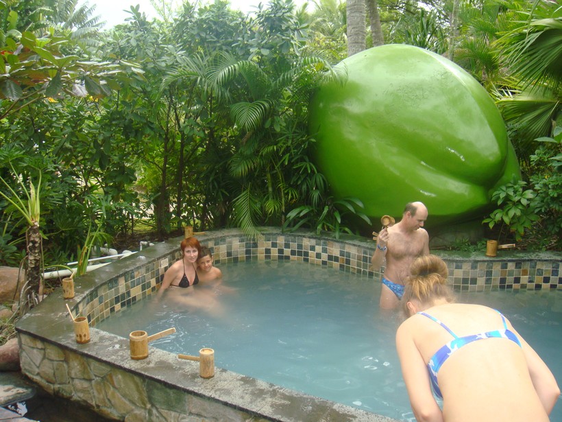 Кокосовый бассейн мне понравился больше всего. Вода в нем больше +40 градусов, поначалу очень горячо, но потом постепенно привыкаешь. Есть специальные деревянные ковшики, которыми можно себя поливать.