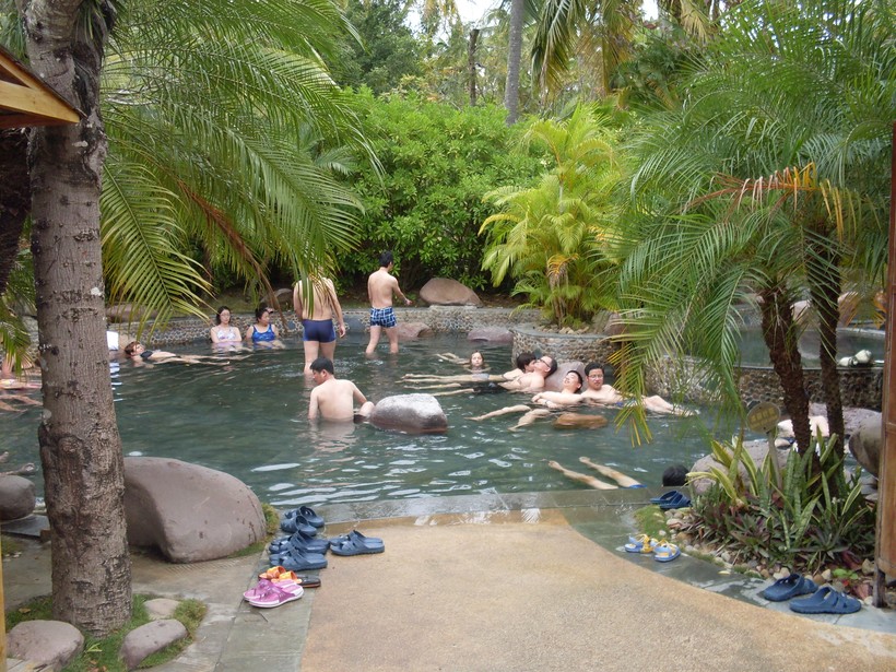 Итак, горячие источники. Это большая зеленая территория под открытым небом, на которой находится больше 30 разных бассейнов. Около каждого бассейна стоит табличка, где указана температура воды и "наполнение", то есть то, какие целебные травы добавлены в воду. Все бассейны разной формы и размера.