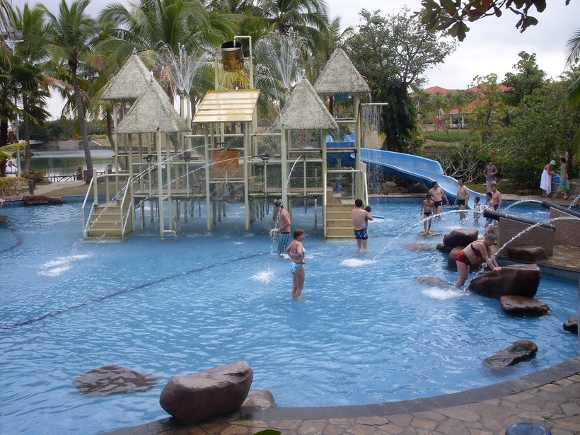 Хотя и взрослые в этом бассейне с удовольствием играют: кто-то использует водяные пушки как массажный душ, кто-то с горок катается, кто-то ждёт, когда его неожиданно обольёт водой из огромной чаши.