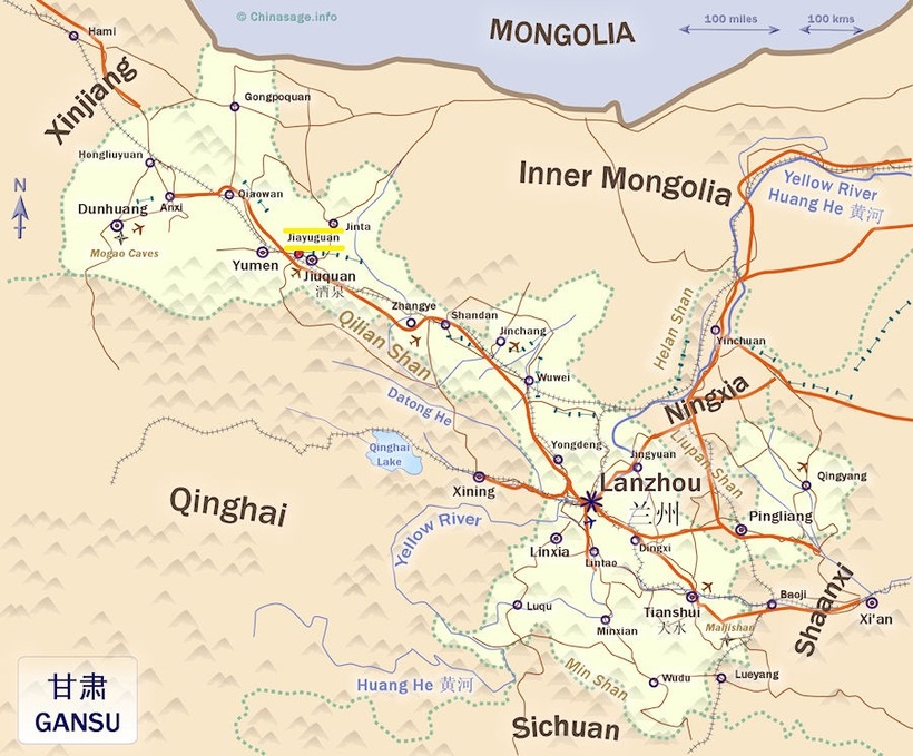 На второй изображены ее основные города, желтым подчеркнут город Цзяюйгуань. Тут также видно с какими провинциями соседствует Ганьсу.