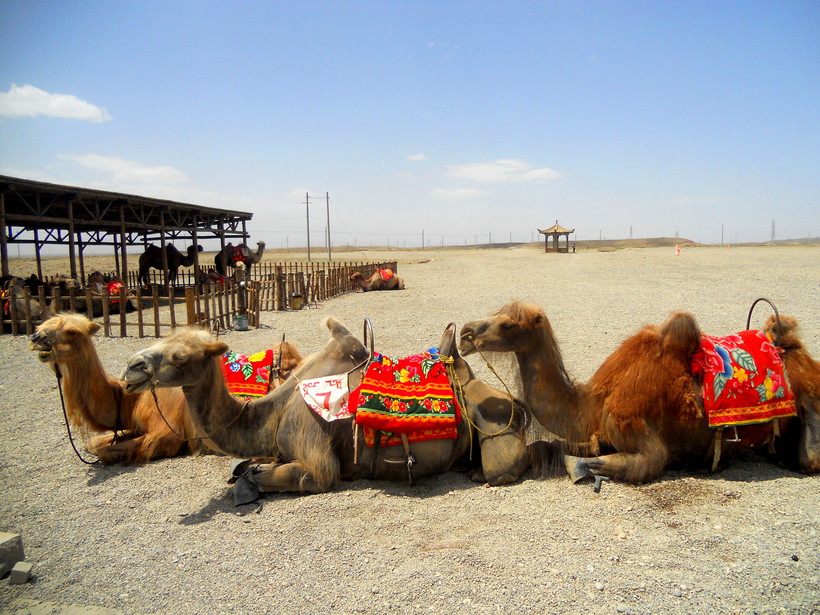 От одних из ворот форта начинается пустыня, там за дополнительную плату можно устроить себе еще один аттракцион — прогулку на верблюде. Подобное развлечение будет стоить 15 $ (100 CNY), а просто сфотографироваться — 3 $ (20 CNY). Мне такая прогулка показалась сомнительным удовольствием, учитывая особый характер этих животных, и что их запах чуешь за версту. Да и дороговато для столь короткой поездки (за те же деньги в Дуньхуане можно устроить себе сорокаминутный поход по пустыне верхом на верблюде). А вот не сфотографироваться с ними я просто не могла, но сделала это исподтишка и совершенно бесплатно.