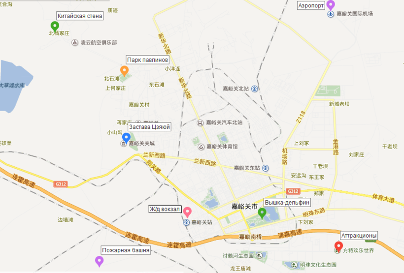 Для начала я отметила на карте основные достопримечательности, а также ж/д вокзал и аэропорт. Хоть все эти места и разбросаны в разных частях города, здесь это не страшно. Расстояния в Цзяюйгуане небольшие, такси стоит недорого, а до некоторых мест можно и на автобусе доехать, так что передвижение по городу — это не проблема.