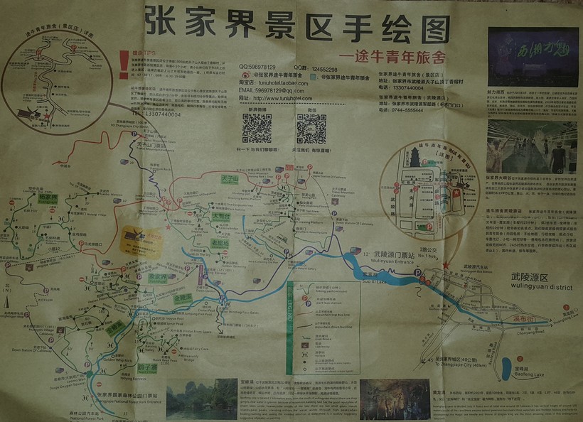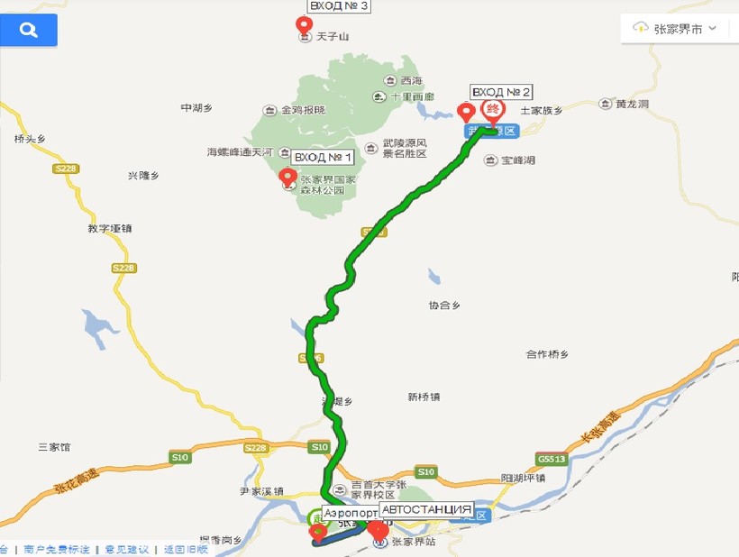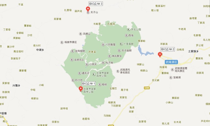 - ближайший к городу вход находится в 32 км от города, и его многие называют деревушкой Чжанцзяцзе по названию входа в парк (张家界国家森林公园门票站 zhāngjiājiè guójiā sēnlín gōngyuán ménpiào zhàn), на карте условно помечен как ВХОД № 1;
