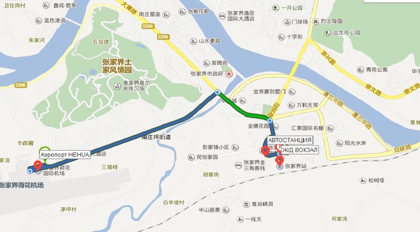Железнодорожный вокзал Чжанцзяцзе имеет очень удобное расположение. Он находится рядом с центром города и аэропортом, к тому же в пешей доступности от него расположена начальная станция канатной дороги до горы Тяньмень (еще одно обязательно место для посещения), а также центральная автобусная станция, от которой можно добраться до национального парка Чжанцзяцзе. На карте проложен маршрут от аэропорта до вокзала (расстояние 4.9 км), а также отмечено расположение аэропорта, ж/д вокзала и центральной автостанции.
