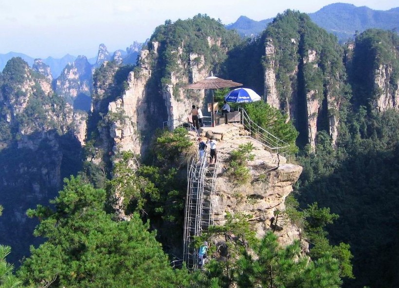В этой части парка туристов ждут крутые ступени и тесные проходы между скалами, шаткие железные лестницы и обрывы. Так выглядит одна из вершин, которая называется Tianbo Mansion (天波府 tiān bōfǔ).