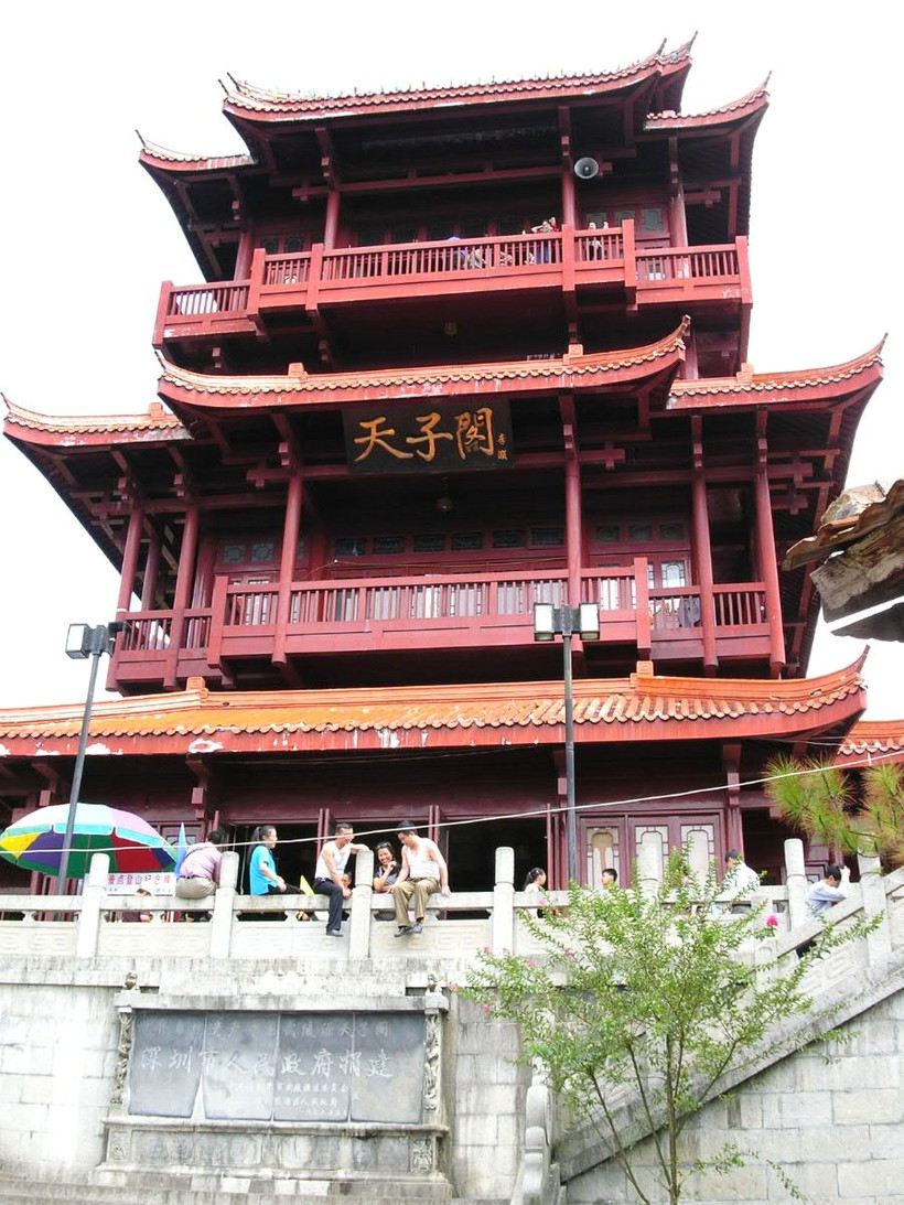 На момент моего посещения парка канатная дорога на гору Тяньцзы не работала, а подниматься пешком не советовал работник хостела. Позже я поняла почему. Даже спустившись с горы пешком, я не чувствовала ног, что уж говорить о том, чтоб на нее забраться. Такой подвиг под силу либо спортсменам, либо китайцам, у которых карабканье по ступенькам это и любимое хобби, и национальная традиция:). А у меня впереди было еще намечено много достопримечательностей, и я решила беречь свое единственное средство передвижения. Чтобы посетить Тяньцзы, я приехала до конечной точки этой части парка на автобусе из Янцзяцзе. Наверху к большой радости есть Макдональдс, так что было решено устроить там обед, учитывая, что больше нигде на территории парка нормально поесть не удалось. А подкрепившись, я отправилась вниз и попутно осматривала пейзажи. Здешние скалы немного отличаются от тех, что удалось увидеть до этого. По дороге есть пагода под названием Дворец Императора (天子阁 tiānzǐ gé), на нее можно подняться и осмотреть окрестности.