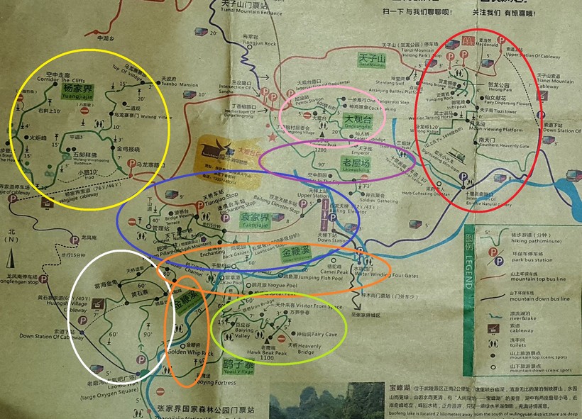 Зона Янцзяцзе была открыта позже остальных, и пока еще не обрела такую популярность, как Юаньцзяцзе. В плане своей развитости она тоже проигрывает. На карте ниже желтым кругом условно обозначена территория Янцзяцзе, а оранжевым внутри нее та часть, которую прошла я.