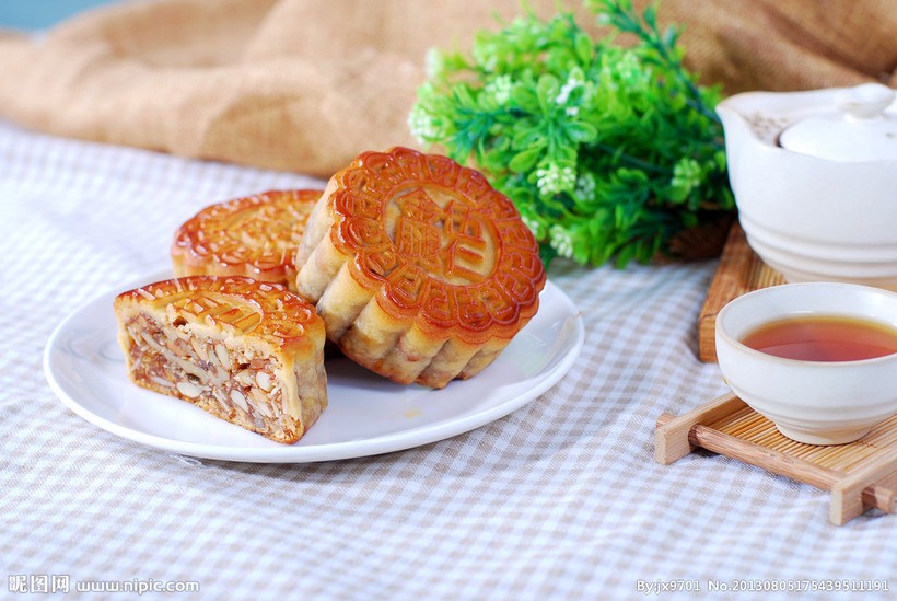 Особенной едой в этот день являются юэбины, или лунные пряники. Юэбины представляют собой небольшие круглые пряники с начинкой. Сверху он украшен иероглифами или картинками.
