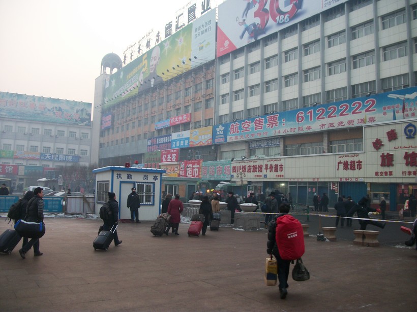 Южный железнодорожный вокзал Урумчи (乌鲁木齐火车站; Wūlǔmùqí Huǒchēzhàn) на улице Цинфэн.