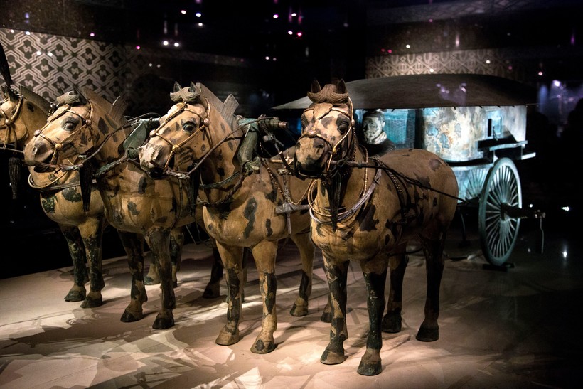 Комплекс гробниц был найден лишь в 1974 году. В нем насчитывается 8099 терракотовых статуй воинов (лучники, пехотинцы, конники) а также колесницы, лошади и орудия, призванных служить императору в загробном мире.