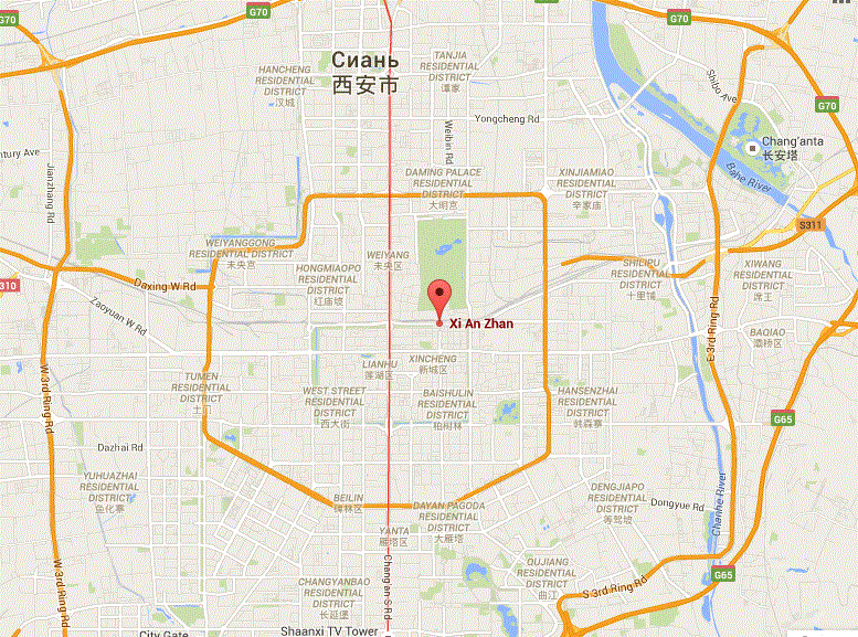 Отметка на карте под названием Xi An Zhan показывает месторасположение главного вокзала. До него ходят автобусы № 13, 14, 25, 30, 40, 103, 231, 500, 511, 602. Также в 15 минутах ходьбы от вокзала есть станция метро 五路口 (Wululou, Линия 1).