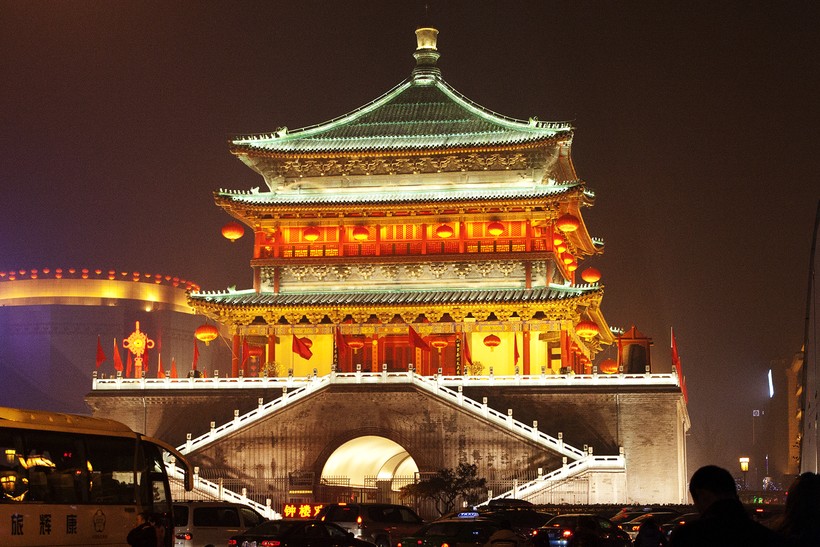 Стоимость билета составляет $8 (54 юаня), студентам – $4 (27 юаней). Стена доступна для посещения с 8:00-22:00, но после 18:00 не на всех участках можно подняться на стену. - Колокольная и барабанная башни. На территории старого (внутреннего) города есть еще два места, которые я бы рекомендовала посетить. Располагаются они совсем рядышком друг от друга. Колокольная башня Сианя 钟楼zhōnglóu (1384 год) и Барабанная башня Сианя 鼓楼 gǔlóu (1380 год). Первая башня получила свое название из-за того, что каждое начала нового дня сопровождалось звоном колоколов на башне.