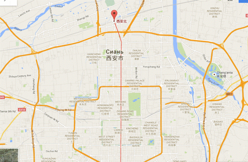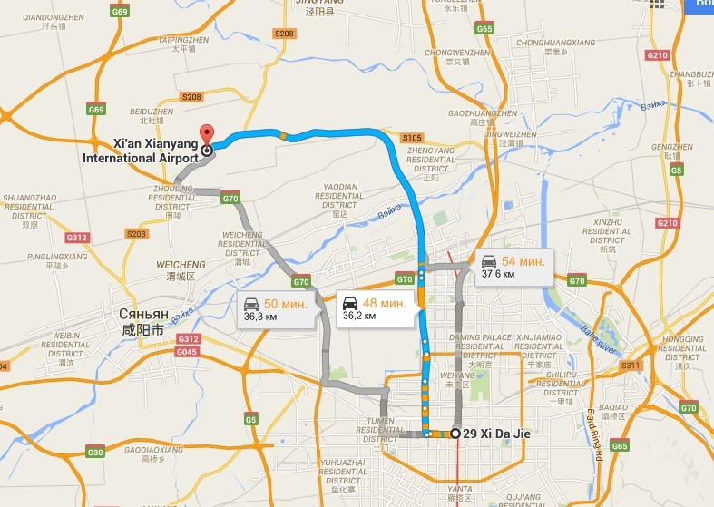 Ближайший аэропорт, который носит название Xi'an Xianyang International Airport (西安咸阳国际机场, xī’ān xiányáng guójì jīchǎng), находится примерно в 40 км от центра Сианя. Ниже на карте можно увидеть его месторасположение и маршрут, проложенный от него в центр города (Колокольная башня).