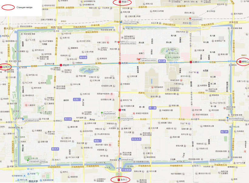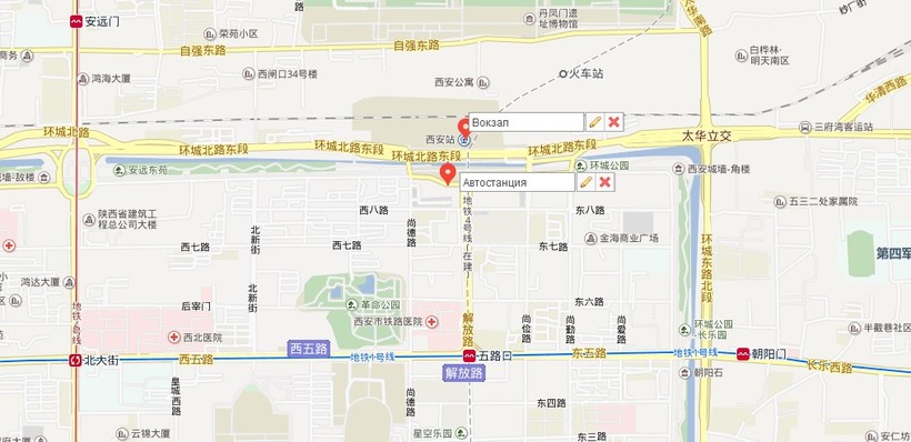 Отметка на карте под названием Xi An Zhan показывает месторасположение главного вокзала. До него ходят автобусы № 13, 14, 25, 30, 40, 103, 231, 500, 511, 602. Также в 15 минутах ходьбы от вокзала есть станция метро 五路口 (Wululou, Линия 1).