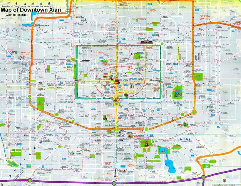 Маленький внутренний квадрат, обозначенный на карте зеленым цветом, — это границы старого города, а центром Сианя считается Колокольная башня. Я же красным обвела ту часть, в которой сосредоточено наибольшее количество отелей и хостелов для туристов.