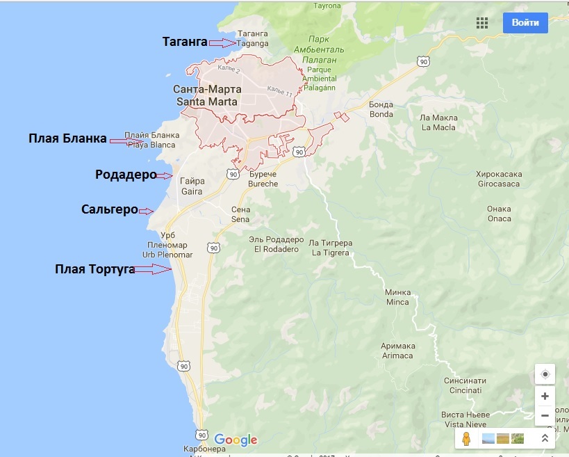 - Такси. За 20-30 минут и 10-15 USD кондиционированное авто домчит вас до Санта-Марты (в Родадеро можно доехать за 15-20 минут и 6-7 USD). Плюс такси в скорости и комфорте, минус в том, что такси не ездит по счетчику и торговаться бывает сложно. Тем не менее цена не заоблачная, поэтому, если вы не любите ездить на автобусе, то это отличный вариант.
