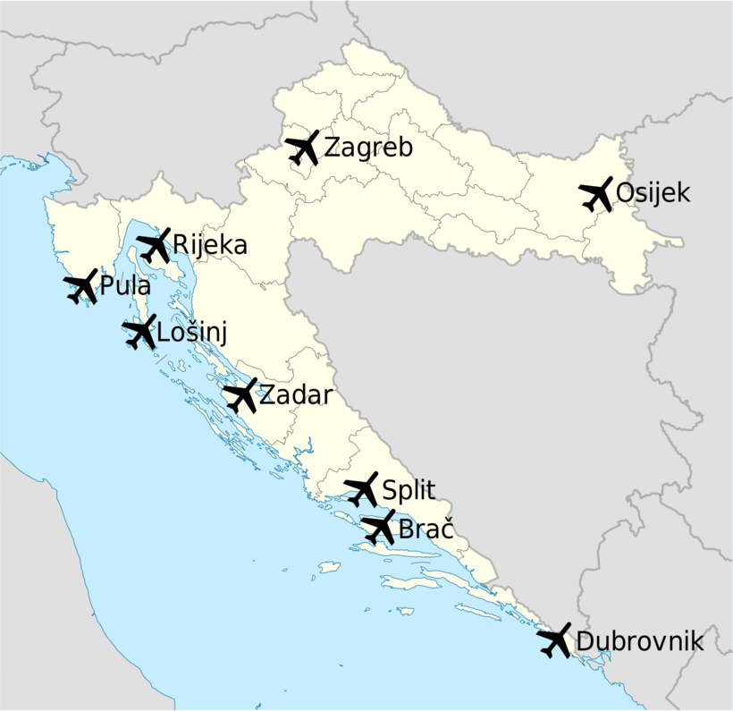 Аэропорты в стране расположены в городах Загреб (аэропорт Плесо или Франьо Туджман), Сплит, Задар, Дубровник, Осиек, Брач (аэропорт Бол), Лошинь, Риека и Пула. Прямые рейсы из Москвы летят до Загреба, Сплита, Риеки, Пулы и Брача. Из Санкт-Петербурга прямых рейсов не бывает.