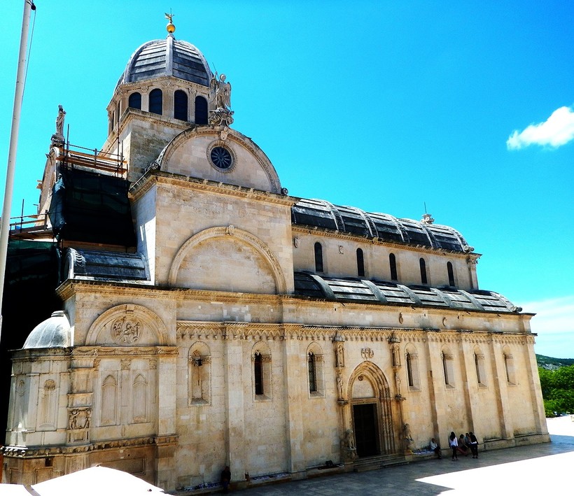 Площадь Хорватской республики (Trg Republike Hrvatske). Вход - 15 кун (раньше был бесплатным). Это главная достопримечательность города, собор входит в список Всемирного наследия ЮНЕСКО. Строительство началось в 1431 году, а закончилось лишь к 1536-му из-за постоянных турецких войн. Над собором работали несколько архитекторов и выстроили его полностью из камня в XV - XVI веках. Его стиль можно отнести как к готическому, так и к стилю эпохи Возрождения. Плотно прилегающие друг к другу каменные плиты соборной крыши были повреждены во время обстрела Шибеника сербскими вооруженными силами в 1991 году. Кровля была с тех пор отреставрирована. Здесь расположена красивая купель, которую обязательно следует увидеть. Она сооружена только из камня, без всяких цементирующих веществ. Еще стоит обратить внимание на вырезанные из камня 72 две человеческих головы на фасаде здания. Это изображения неизвестных: простых прохожих, моряков, торговцев и крестьян, которые жили в Шибенике в то время, когда строился собор. Статуи Адама и Евы тоже весьма любопытны: Адам закрывает руками грудь, а Ева - живот.