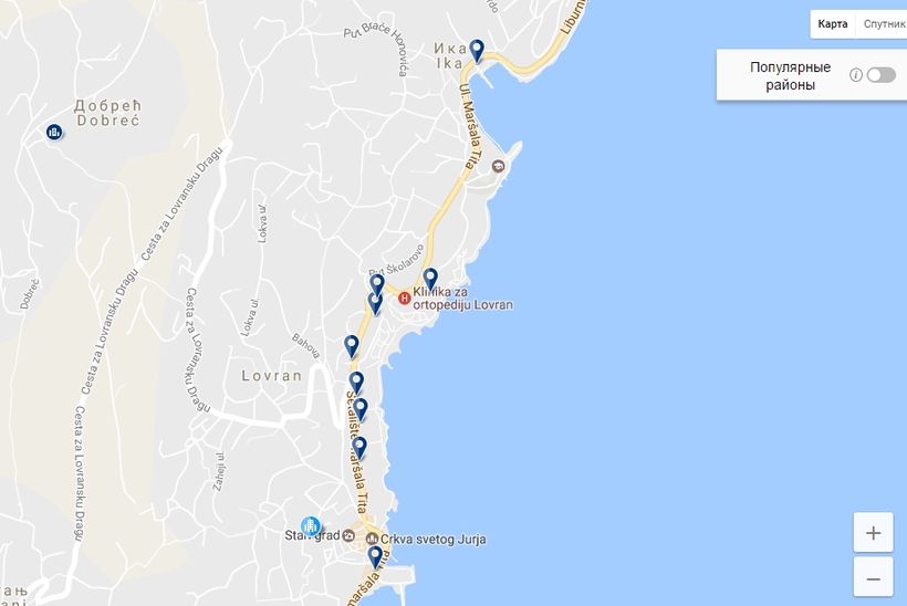 Ловран — небольшой город, поэтому вариантов размещения здесь не так уж много, а деление на районы как таковое отсутствует. Но, несмотря на это, есть из чего выбирать. Я бы советовала селиться в любом понравившемся месте, добраться из пункта А в пункт Б не составит труда.