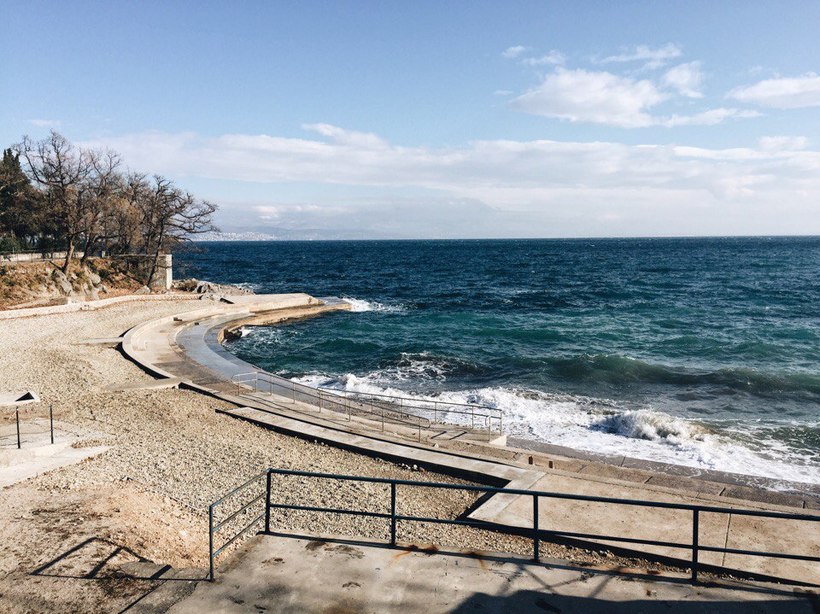 - Пляж «Кварнер»Пляж расположился рядом с одноименным отелем и представляет собой многоуровневую бетонную платформу с обустроенными лесенками для спуска в воду. Здесь так же предусмотрены душ, кабинки для переодевания и туалеты.