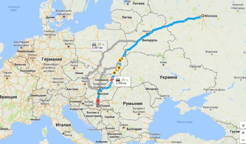 Путь из Москвы в Осиек на автомобиле составить чуть больше 2 000 километров, как я писала выше. В дороге лучше спланировать одну-две ночевки. Например, в Минске и словацком Кошице.