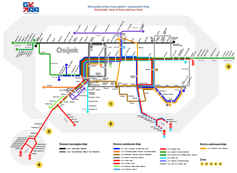 В отличие от трамваев, у автобусов более разветвленная сеть маршрутов, которые связывают сам Осиек и его окрестности. Для путешественников интерес представляет автобус № 7, на котором можно доехать до Зоопарка.