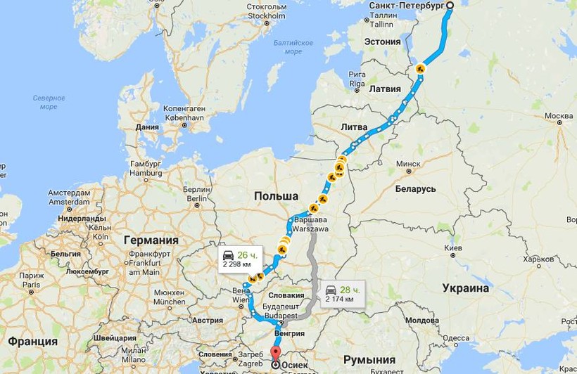 По большей части путь петербуржцев в целом похож на путь из Москвы с некоторыми нюансами. Если планируете одну ночевку, то оптимальным вариантом будет Варшава. А для двух ночевок можно предпочесть Каунас и Кошице.