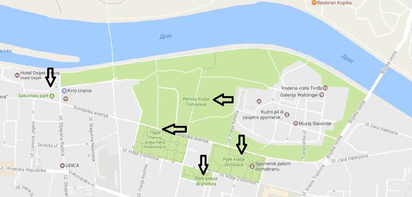 Главные парки города, получившие свои имена в честь хорватских королей, расположены вокруг крепости Tvrđa: