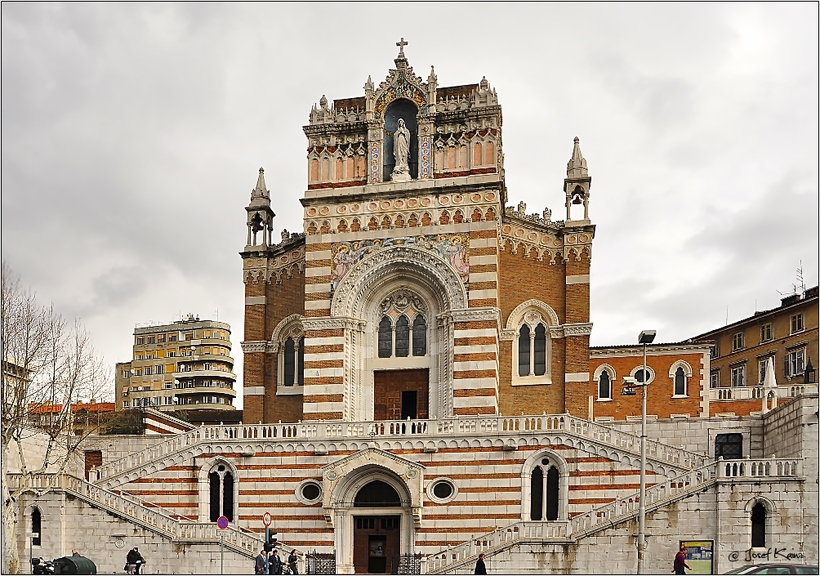 Церковь Божьей Матери Трсатской была возведена в XV веке на месте, где согласно легенде чудесным образом появился дом Девы Марии. С тех пор толпа паломников не иссякает.На территории комплекса расположен францисканский монастырь, часовня и паломнический центр. Собственно он, на мой взгляд, самый интересный. Здание включает несколько залов для разных паломнических целей, а его аркады функционируют как исповедальни во время крупных мероприятий.