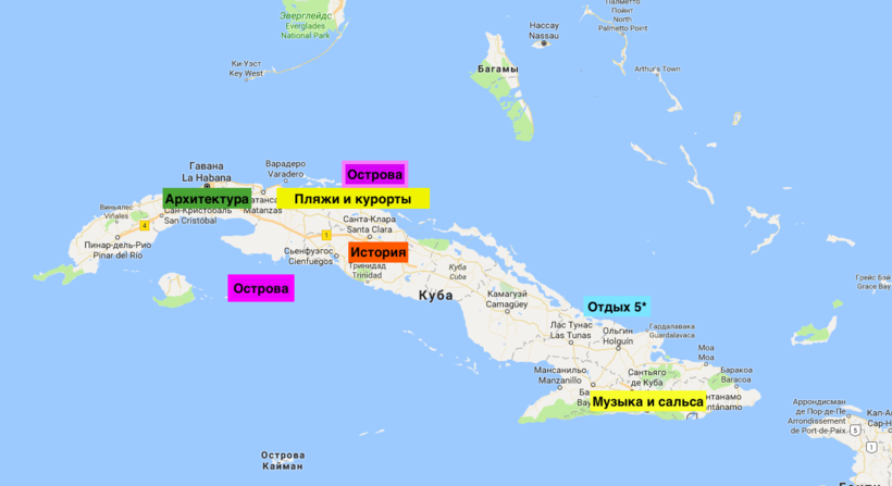 Кубу можно условно разделить на несколько туристических регионов по основным потребностям путешественников, как показано на карте ниже.