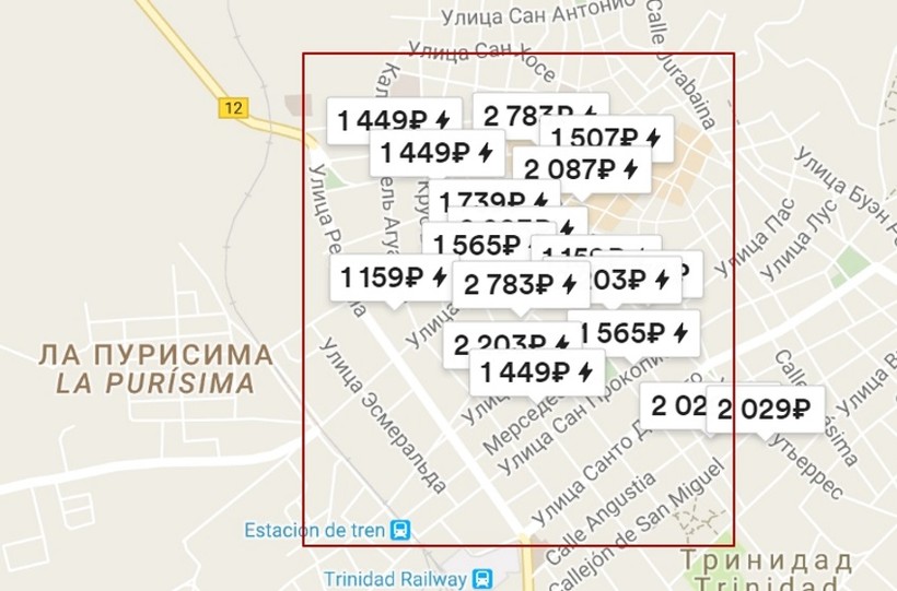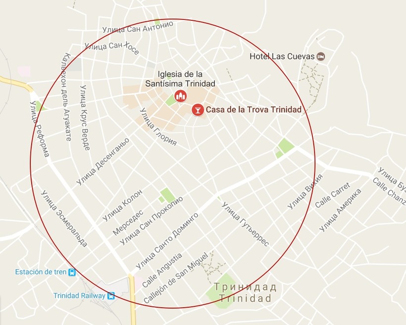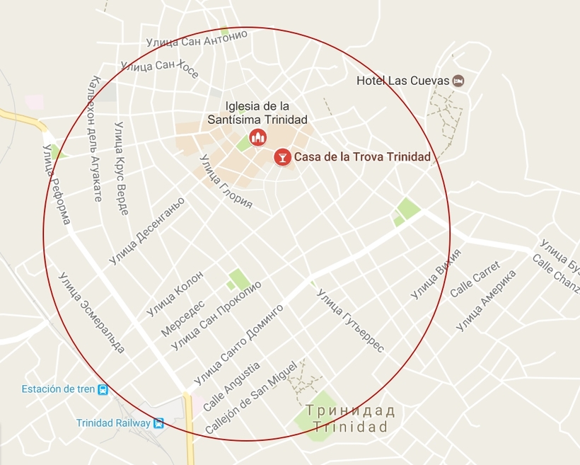 Тринидад — очень маленький город. Больше всего вариантов размещения находится на участке между главной площадью и ж/д вокзалом.
