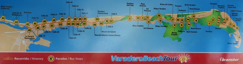 Для туристов в Варадеро организован специальный рейсовый двухэтажный автобус. Его легко узнать – он красного цвета с надписью «Varadero Beach Tour». Ходи он довольно часто, останавливается на специальных остановках. Стоимость билета — 5 USD, он действует весь день. Автобус курсирует по Варадеро с 9 утра до 9 вечера.