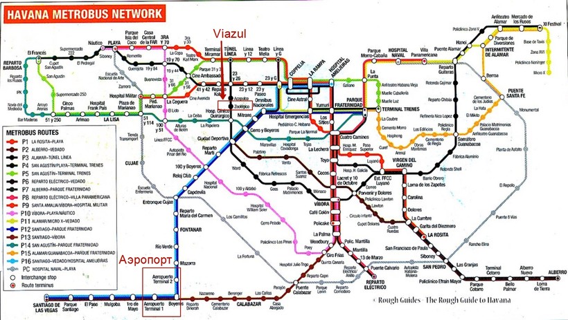 - Рейсовые автобусы курсируют из аэропорта в центр города. Об этом варианте мало кто знает, и выбирать его следует только в том случае, если у вас достаточно времени, так как этот транспорт на Кубе не имеет четкого расписания и ходит, когда хочет. Билет приобретается у водителя, стоит он 0,04 USD (1 CUP — песо националь). Поменять деньги вы можете в обменном пункте в аэропорте, заодно попросите дать вам 1 песо для автобуса, так как у водителя может не быть сдачи. Дорога до остановки Zoologico, напротив которой находится терминал Viazul, займет около 40 минут без ожидания транспорта. Вам подойдут автобусы P12 или P16. На любом из них вы можете доехать до станции Mitrans и пройти оттуда пешком, или выйти на станции Cuidad Deportiva и пересесть на P3, который довезет вас прямо до Zooloigo. Второй вариант (с пересадкой) заставит вас раскошелиться еще на 0,04 USD.