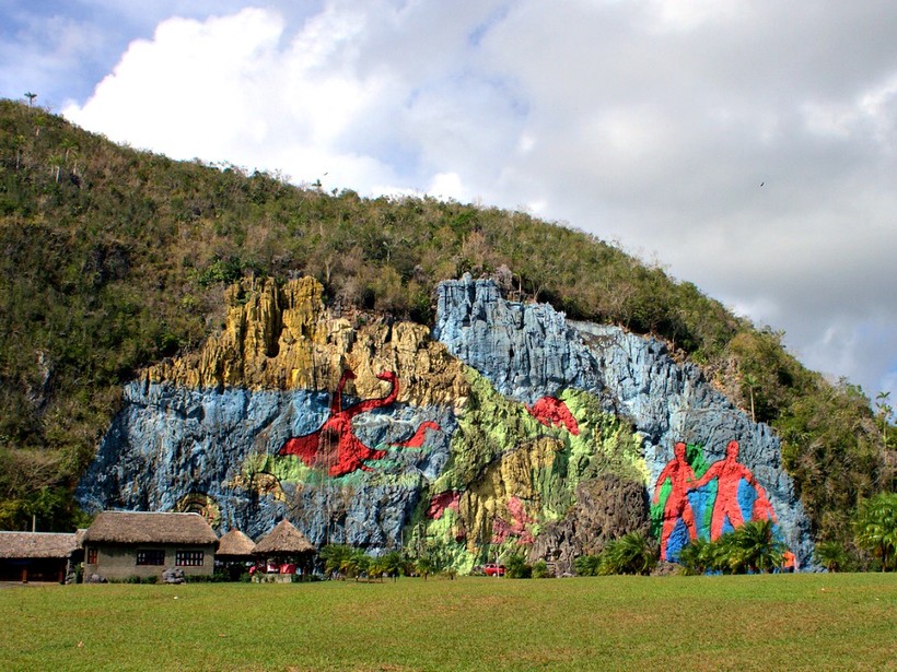 - Настенная роспись «Предыстория» — это работа известного кубинского художника, который украсил скалу образами в стиле доисторических наскальных рисунков. Честно говоря, мне такое вмешательство в девственную природу парка не кажется полезным вкладом в развитие долины, но рисунок делает свое дело, став еще одной визитной карточкой местности и привлекая туристов.