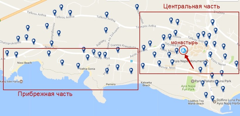 Айя-Напу можно разделить на две зоны: центр и прибрежная часть города.Выбор отеля зависит от ваших желаний и потребностей в отдыхе — подобрать подходящий вариант можно на Букинге, а цены стоит сравнить здесь. О ценах на отдых я расскажу ниже.