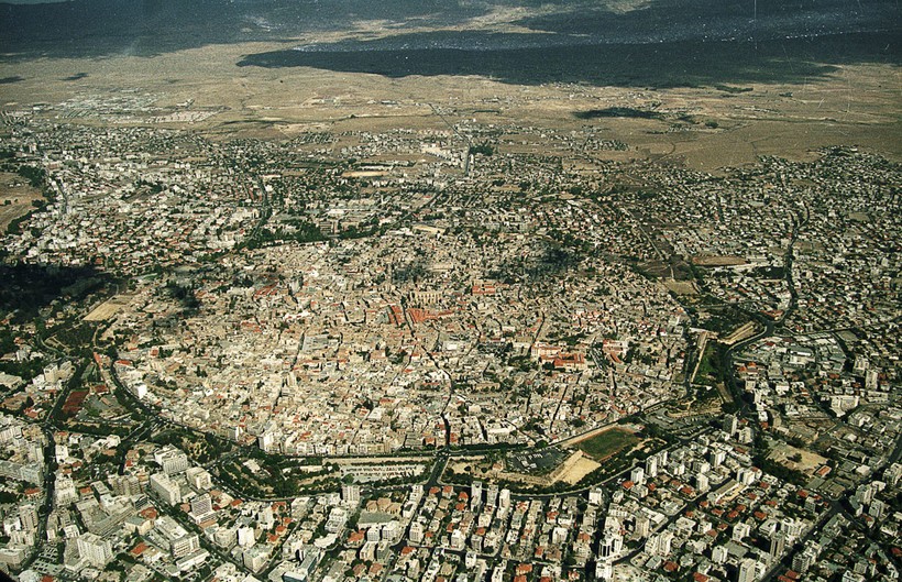 Во-первых, столица как греческого, так и турецкого Кипра — Никосия. Она, как и остров, поделена на две части границей, проходящей прямо посередине Старого города. Общий для обеих сторон Старый город до сих пор находится в стенах, к сожалению, почти полностью разрушенной древней крепости. Она обнесена глубоким рвом, за счет чего видны ее четкие границы. Это хорошо видно на фото ниже.