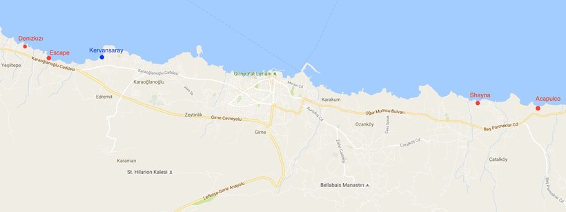 Муниципальных (бесплатных) пляжей в городе слишком мало, чтобы выбирать. Я лично посещаю только Kervansaray в районе Karaoğlanoğlu и безымянный пляж рядом с рестораном Cabin в районе Lapta. До них также можно добраться на маршрутке Гирне — Лапта (Girne-Lapta) и, кстати, оба они живописнее многих частных будут. Kervansaray является в принципе моим любимым пляжем в черте города, берег расположен в выгодном по отношению к солнцу ракурсе, и наблюдать закаты здесь особенно волшебно.
