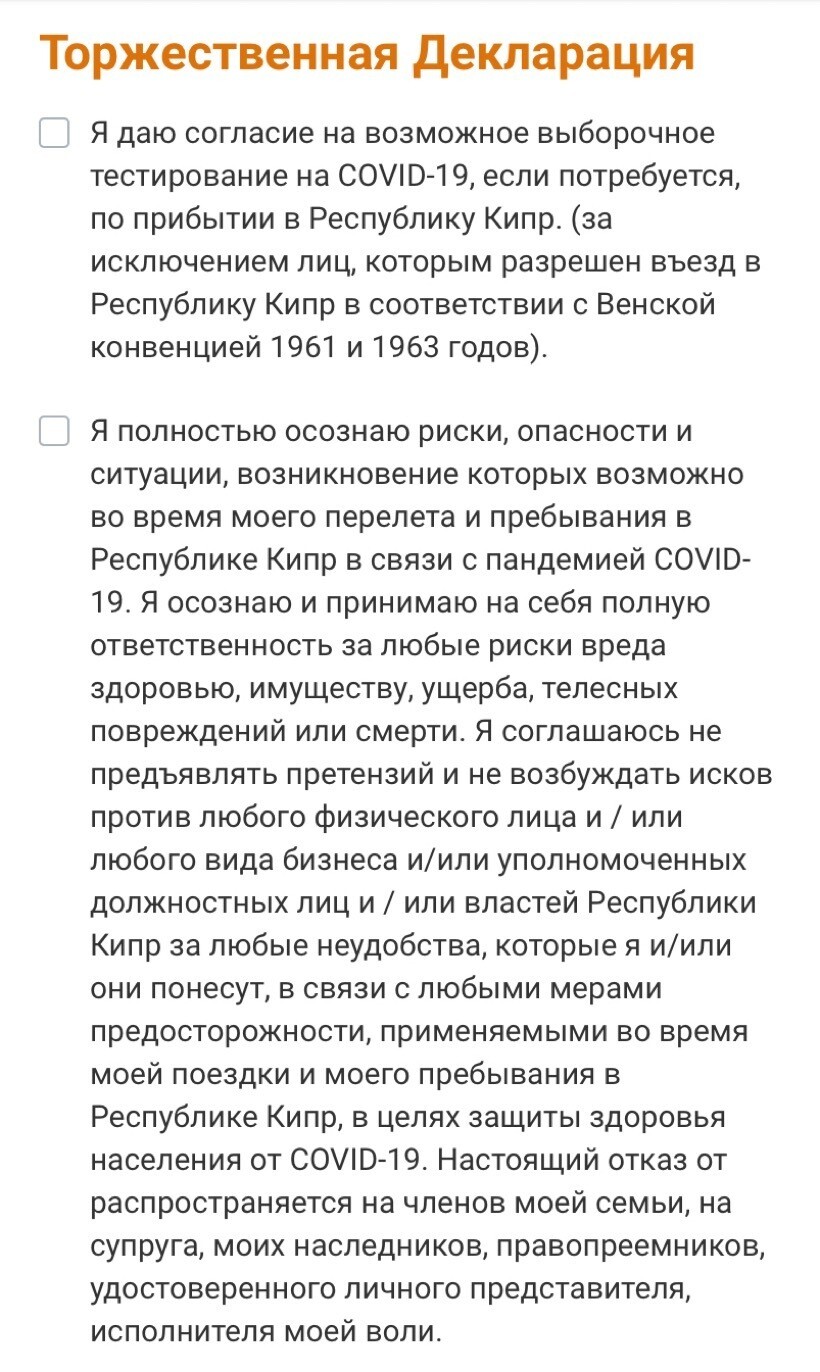 Согласно правилам, въезд на Кипр для россиян сейчас разрешен только в том случае, если они перед прилетом заполнят анкету на сайте Cyprus Flight Pass. Туристу нужно сделать это не ранее чем за 24 часа до вылета. Без этого его не имеют права пустить на борт. В том случае, если каким-то образом он прилетел на остров без заполненной анкеты, его ждет штраф в 30000 евро.